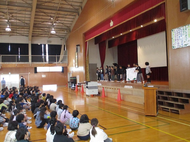 今日は11月の全校集会が行われました。校長の話に続いて、4年生が第2期(10月~12月)の生活のめあて「思いやりの言葉をかけよう」について発表しました。4年生は教室前にふわふわ言葉(思いやりの言葉) …