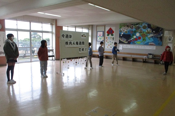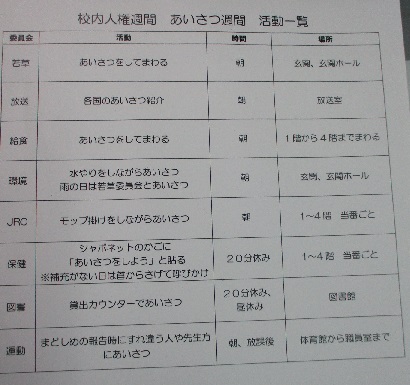 今週は、人と人のかかわりを見つめ直し、相手を尊重する人権週間です。人間関係の基本はあいさつということで、各委員会があいさつにかかわってできることを考え、委員会単位で実行しています。「あいさつをして回る」ほか、「各国のあいさつを紹介」、「当番活動のモップ掛けをしながらあいさつ」「本の貸し出しをするときカウンターであいさつ」など、それぞれの委員会ができる範囲で取り組んでいます。