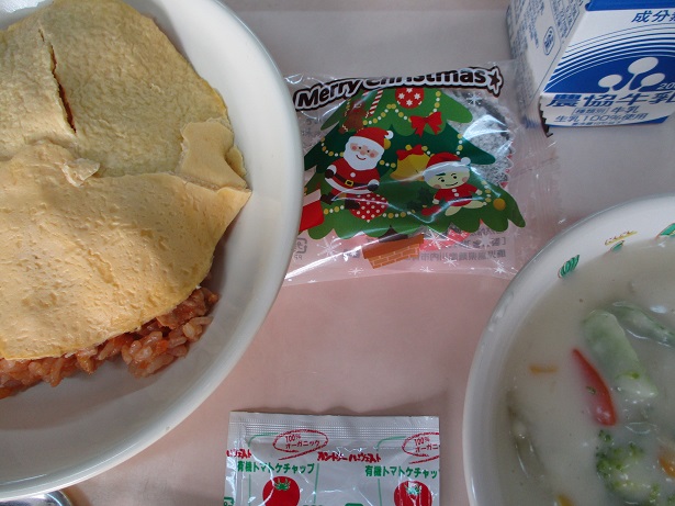 本日、今年最後の給食は、クリスマス給食でした。オムライスとクリームシチューにクリスマスのケーキが加わり、子どもたちも大喜びでした。