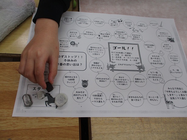 各教室でも冬休みの思いで発表や2026すごろくが行われ、楽しい雰囲気で学校生活がスタートしました。体育館では3年生が元気に大繩に挑戦していました。休み時間には、この時期には珍しい乾いたグラウンドで思いっきり遊んでいました。寒い中でも元気一杯な子どもたちです。