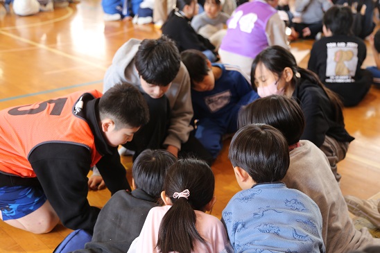 1月30日になかよし班(縦割り班)の大繩大会が行われます。今日はそのための練習会。6年生が大繩を回し、なかよし班の1から5年生が大繩にチャレンジします。大繩に入るタイミングがつかめなかったり怖がったりする児童もありますが、お兄さんお姉さんのサポートで勇気を出して大繩に向かっていきます。練習を終えた後は、大会でのめあてや作戦を相談していました。本番も頑張ってください。