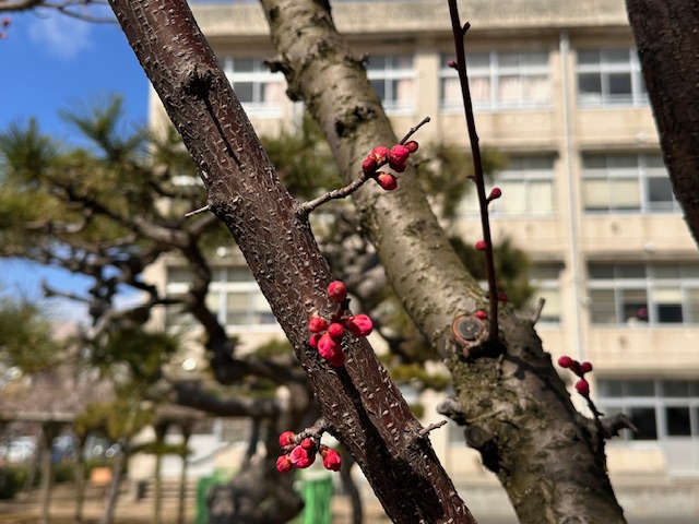 はばたきの森にある桃山小学校のシンボルである桃の木のつぼみがふくらみました。来週には開花する見込みです。卒業式には、きっとすてきな笑顔満開の花を咲かせてくれることでしょう。
