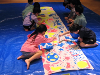 9月25日に1年生が、いくとぴあ食花に校外学習へ出掛けました。蛍光絵具を使い、仲間と協力して、宇宙の絵を描きました。ブラックライトを作品に当てて、光る様子を見て、子どもたちは歓声を上げていました。