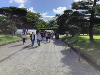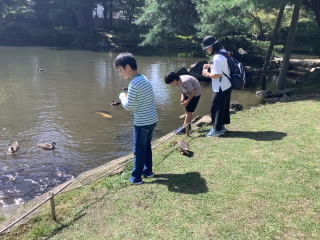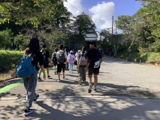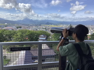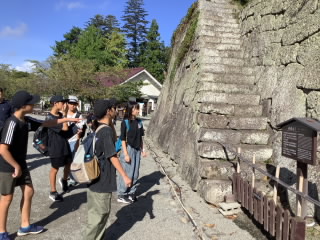 晴天のもと、修学旅行2日目が始まりました。宿泊施設を出発して、鶴ヶ城会館を目指しました。6年生と引率職員で、鶴ヶ城を背景に、集合写真を撮りました。石垣を見て、その大きさに驚いたり、天守閣から市内を展望して、感動していました。この後、班別行動となります。御薬園でカルガモに餌やりをしたり、市内循環バスに乗ったりして、飯盛山や七日町へ向かいました。