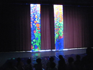 9月25日に1年生が、いくとぴあ食花に校外学習へ出掛けました。蛍光絵具を使い、仲間と協力して、宇宙の絵を描きました。ブラックライトを作品に当てて、光る様子を見て、子どもたちは歓声を上げていました。