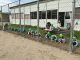 年長組の保育室ベランダ前に畑を作りました。今日は、年長組・年中組でジャガイモの種イモを植えました。先生と一緒に種芋を包丁で切り、腐敗防止の灰を付けてから、優しく畑に植えました。しっかりと土をかけた後 …