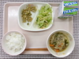 今日の給食のメニューは、ごはん、肉じゃが、青のり大豆、アーモンドキャベツ、牛乳でした。 カリッと揚がった大豆に、青のりで味付けした青のり大豆は子どもたちに人気なメニューの一つです!2月の …