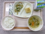 今日の給食のメニューは、ごはん、みそワンタンスープ、魚と大豆のチリソース煮、きゅうりのあっさり漬け、牛乳でした。