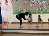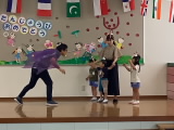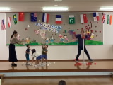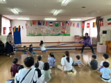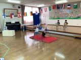 職員のプレゼントは劇遊び『とんぼの運動会(誕生会Ver.)』です。誕生児もとんぼになって劇に参加しました。とんぼたちと職員が扮したギャングコウモリが、運動会の遊びで対決します。玉入れ対決、綱引き対決、熱のこもった勝負に見ているお友達も「とんぼがんばれー!」と応援していました。保育室に戻っても、とんぼやカエルになり元気に走ったり、劇の雰囲気を感じながら遊ぶ子どもたちの姿が見られました。