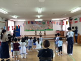 暑い暑い夏に生まれた3人のお友達の誕生会です。少しドキドキしながら、お名前や大きくなったらなりたいものなどお話してくれました。誕生児のお友達は、園長先生からお祝いの言葉を頂いたり、お友達から歌のプレゼントをもらったりして、にこにこになりました。