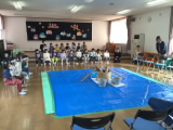今日は、カラフルカラー献立でした。色を英語にして献立名をつけてみたそうです。イエローライスは黄色、ハンバーグ~レッドソースかけ~は赤色、グリーンサラダは緑色、デザートのブルーゼリーは青色をさす英語がかくれています。