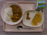 今日の給食のメニューは、ごはん、ポークカレー、福神漬け、フルーツカクテル、牛乳でした。
