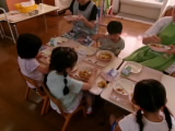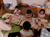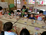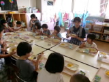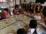 今日は豚肉の入ったポークカレーがでました。さつまいもやじゃがいも、グリンピースなど野菜も沢山入っていましたが、カレーには苦手な野菜も食べられるようになる不思議なパワーがあるようで、おかわりをしている子も多くいました。年中・年長組さんは、私が給食の様子を見に行った頃には、ほとんどの子がすでにカレーを完食していてデザートを食べ始めていました!やはり、カレーは子どもたちに大人気のようですね♪