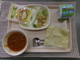 みなさんは、やきそばにミートソースがかかった新潟市のB級グルメを知っていますか?今日の給食では、あの有名なB級グルメに似せて、中華めん用のミートソースを考えてくださったそうです。いつものミートソースとは少し違い、具材にもやしが入っています。ご当地の味を給食バージョンで味わっていました♪