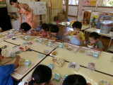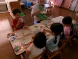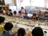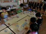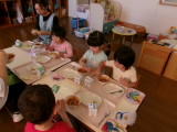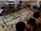 ミートソースを口の周りにつけながらも美味しそうに食べていました!上手に麺とソースをからませながら、パスタのようにフォークでぐるぐると巻いて食べていました。全部食べ終わった後にはデザートの冷凍パインもありました♪年中・長のお部屋では、苦手な野菜を食べようと頑張っている年中組の子を、年長組のお姉さんが応援している場面もみられました。応援のおかげもあってか、食べることができて二人ともにっこり笑顔の様子をみることができました!