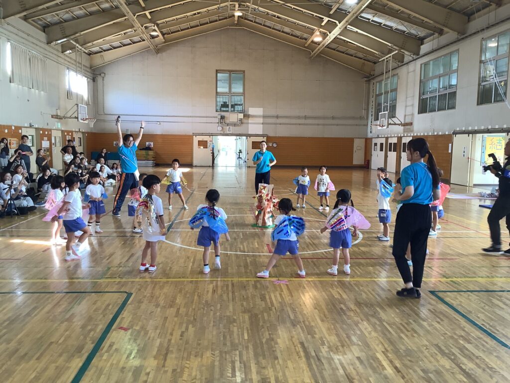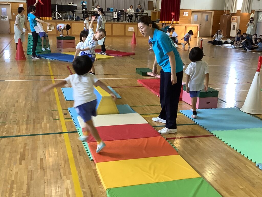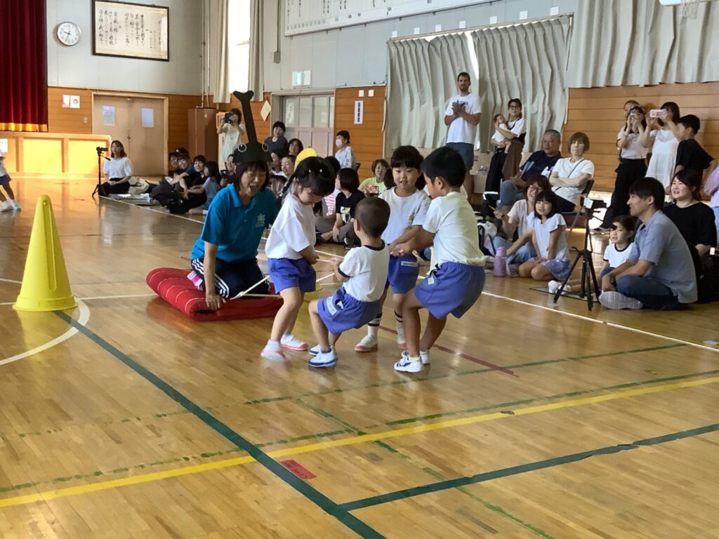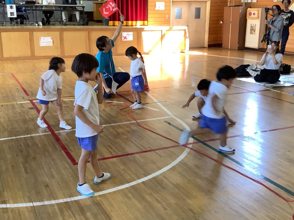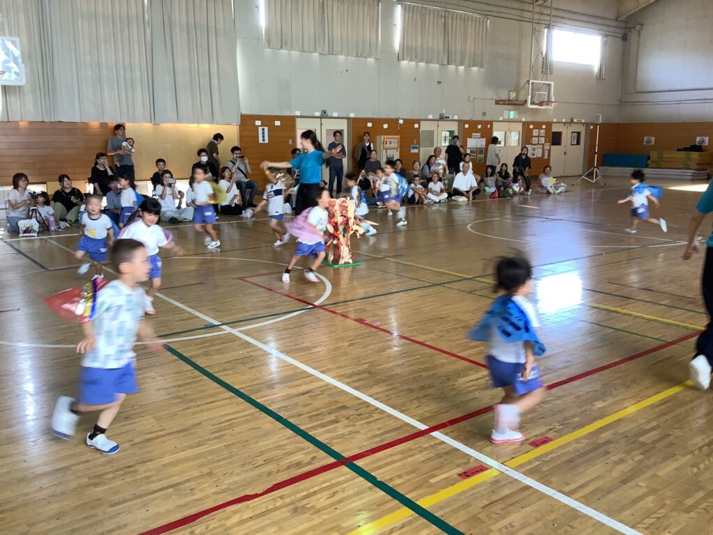 その後、興味走「とんぼのうんどうかい」にみんなで挑戦しました。異年齢でチームを作り、様々なミッションに挑戦します。カブトムシ(園長先生)を乗せたマットを引っ張ったり、コウモリの的にボールを投げたり、橋を渡った後に自分の限界までジャンプしたり・・・普段楽しんでいる遊びの様子や、全力で頑張る様子をお家の方々に見てもらいました。子どもたちの様子にたくさんの応援や拍手が聞こえてきました。