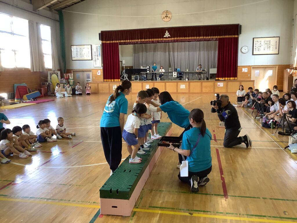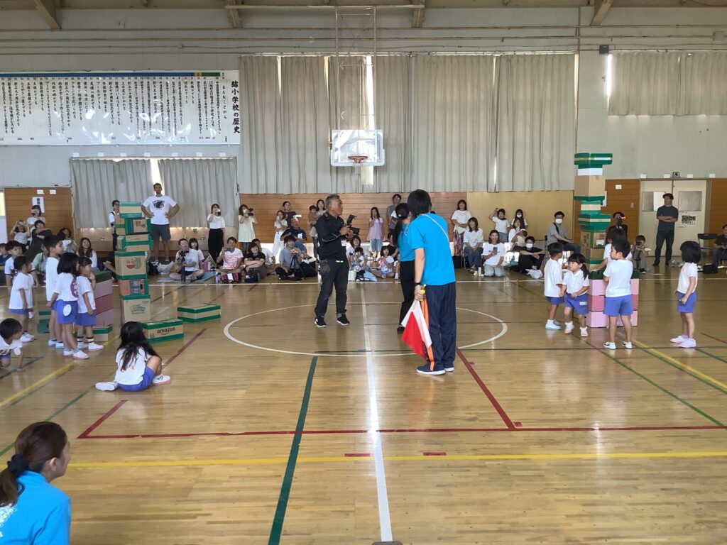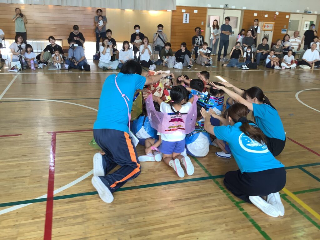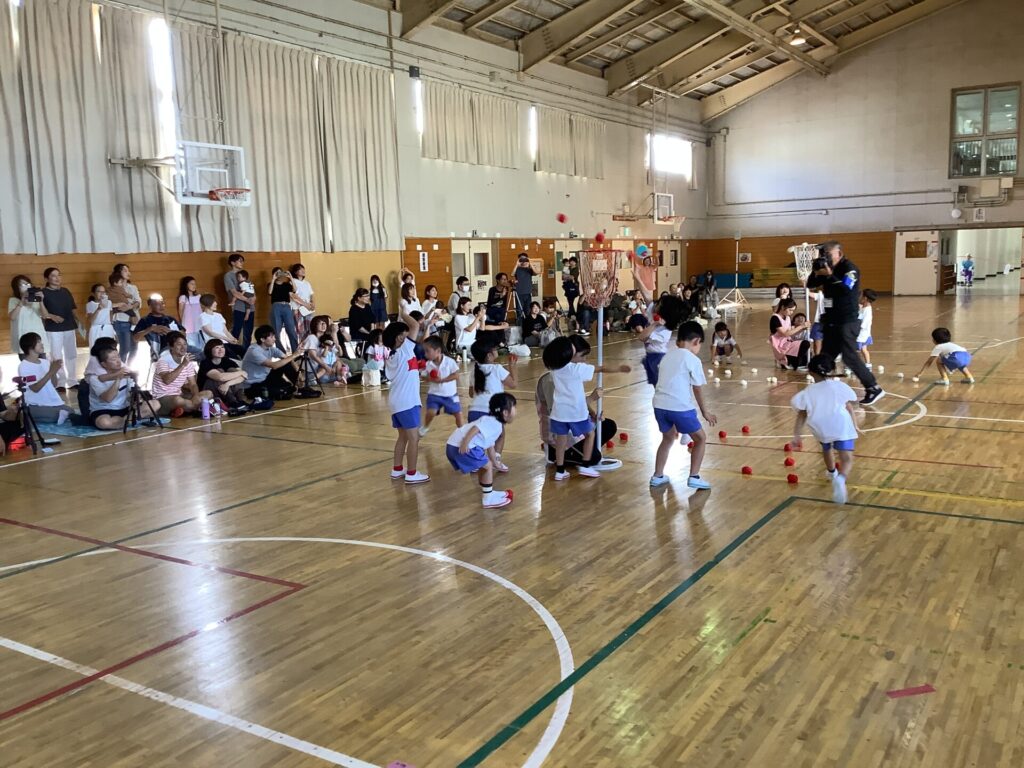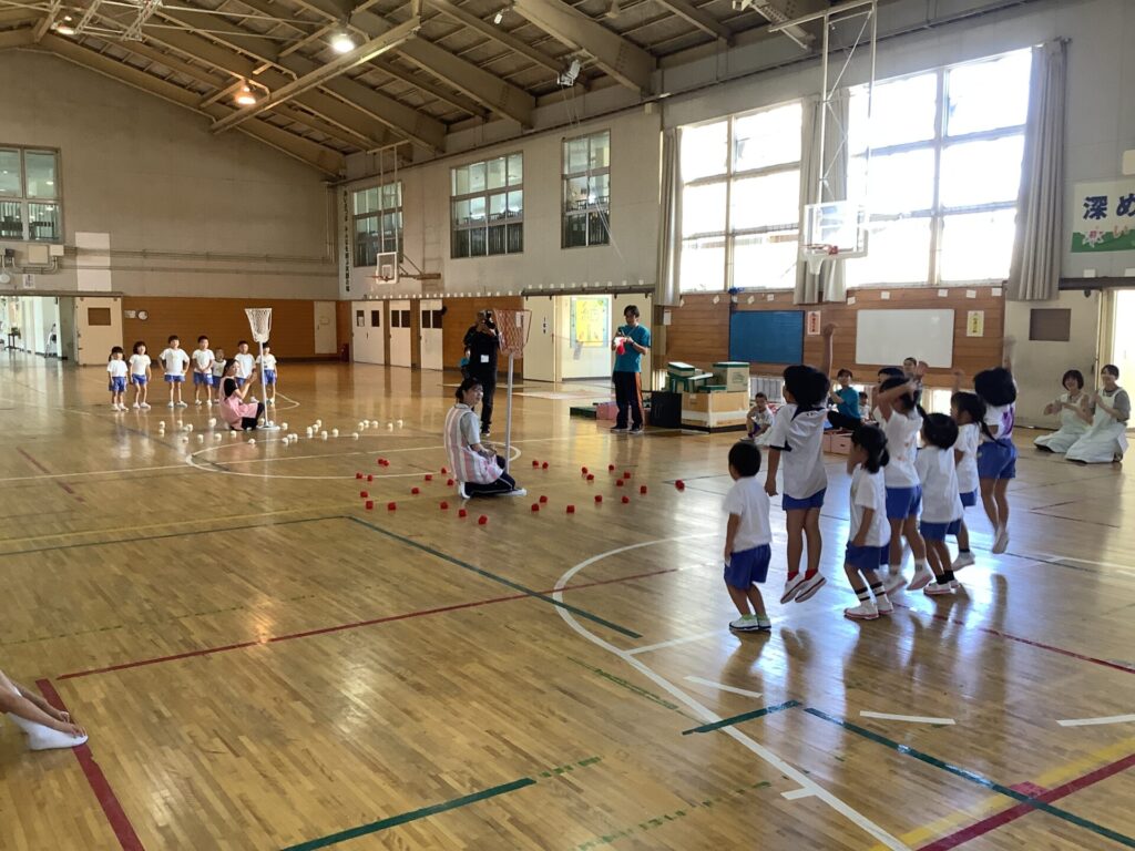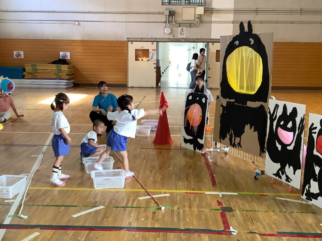 その後、興味走「とんぼのうんどうかい」にみんなで挑戦しました。異年齢でチームを作り、様々なミッションに挑戦します。カブトムシ(園長先生)を乗せたマットを引っ張ったり、コウモリの的にボールを投げたり、橋を渡った後に自分の限界までジャンプしたり・・・普段楽しんでいる遊びの様子や、全力で頑張る様子をお家の方々に見てもらいました。子どもたちの様子にたくさんの応援や拍手が聞こえてきました。