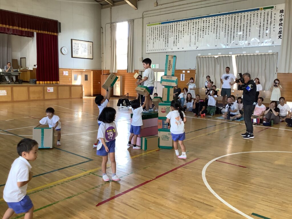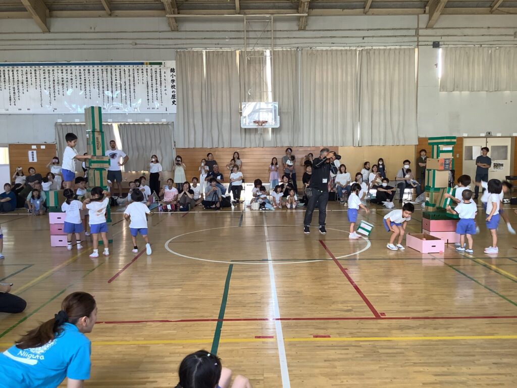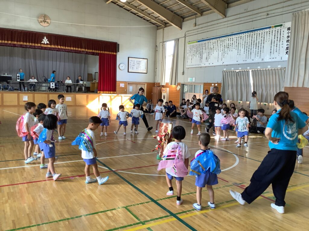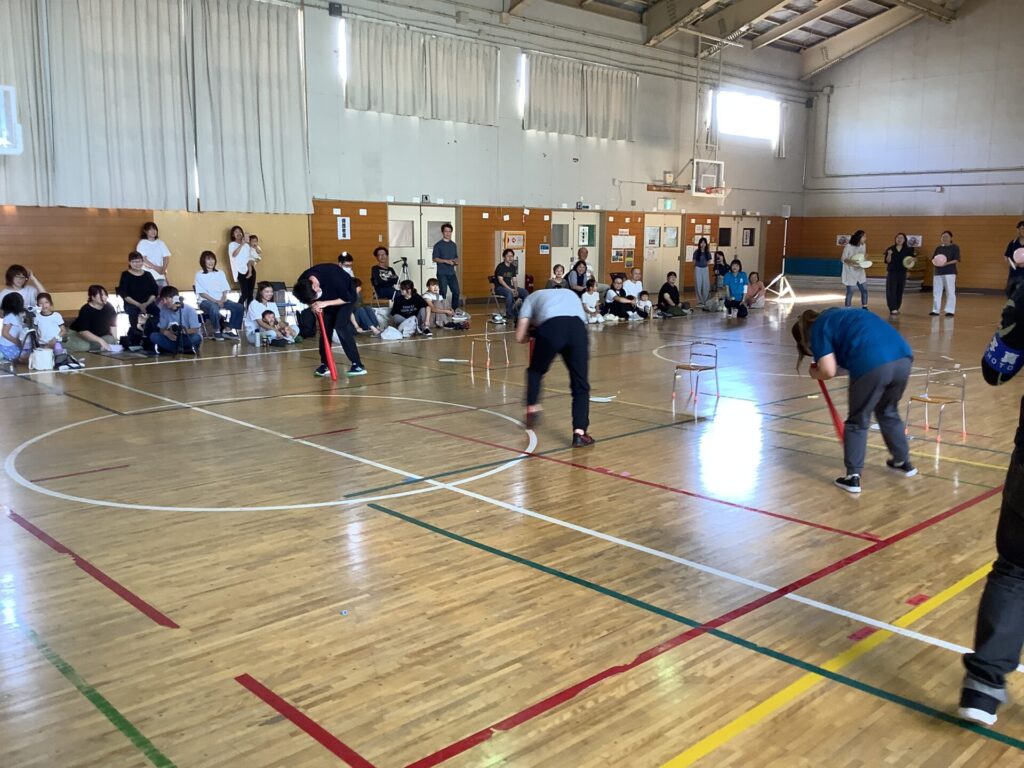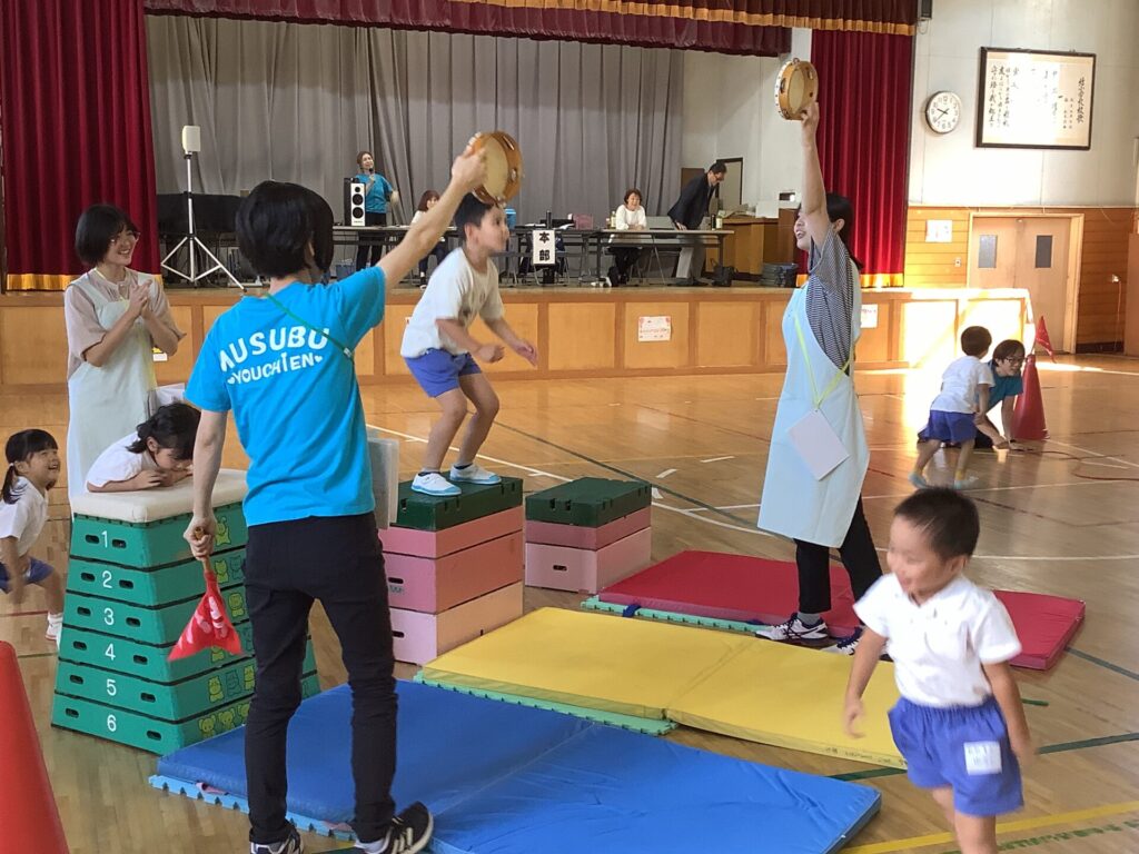 その後、興味走「とんぼのうんどうかい」にみんなで挑戦しました。異年齢でチームを作り、様々なミッションに挑戦します。カブトムシ(園長先生)を乗せたマットを引っ張ったり、コウモリの的にボールを投げたり、橋を渡った後に自分の限界までジャンプしたり・・・普段楽しんでいる遊びの様子や、全力で頑張る様子をお家の方々に見てもらいました。子どもたちの様子にたくさんの応援や拍手が聞こえてきました。