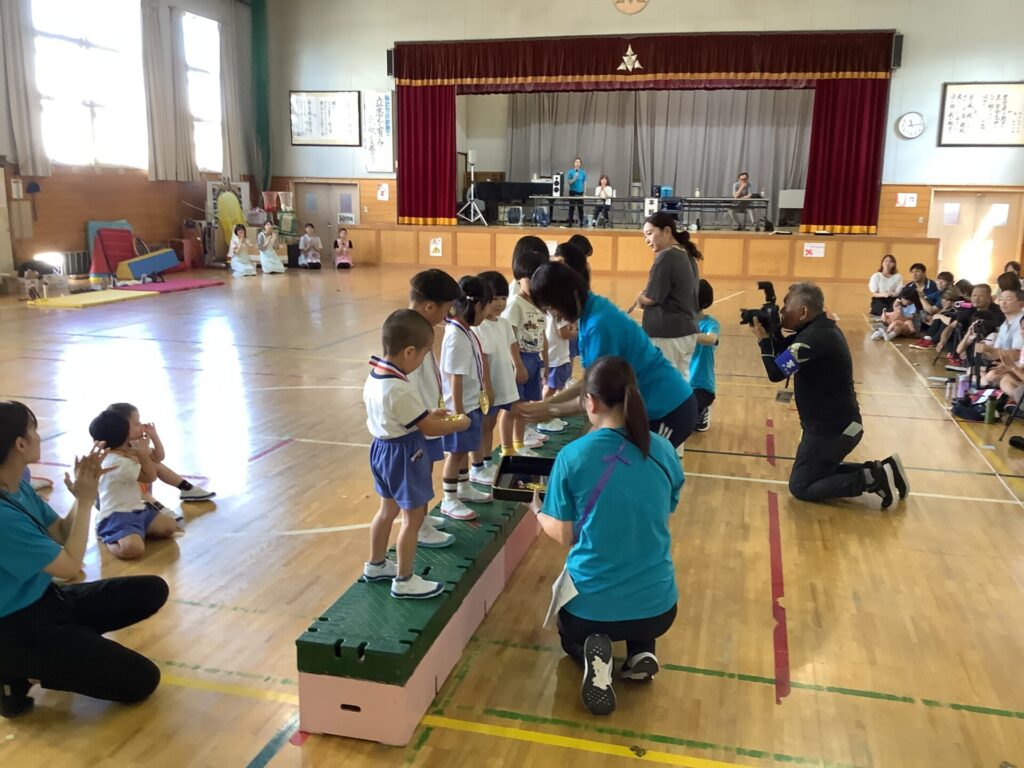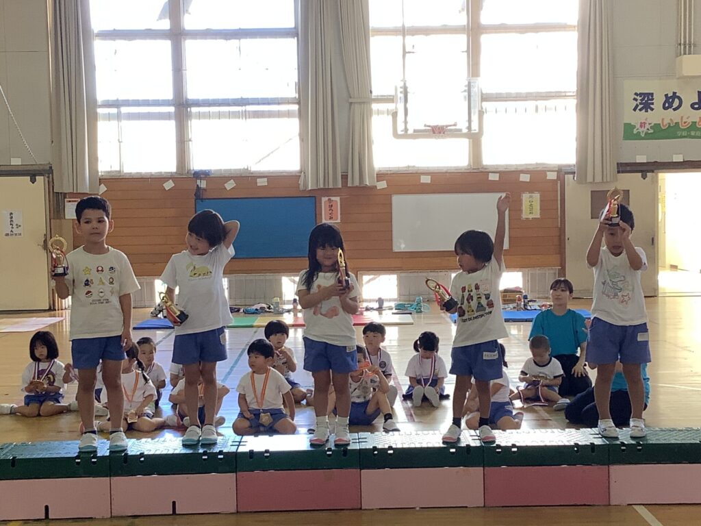 全競技をやりきった子どもたち、疲れたけれどその顔はやり遂げた「自信」や「満足感」にあふれていました。園長先生、PTA会長からご褒美のメダルやトロフィーを頂くと、パッと嬉しそうな笑顔があふれました。
