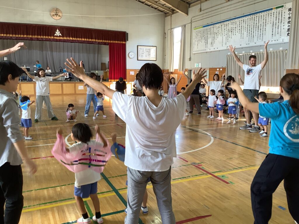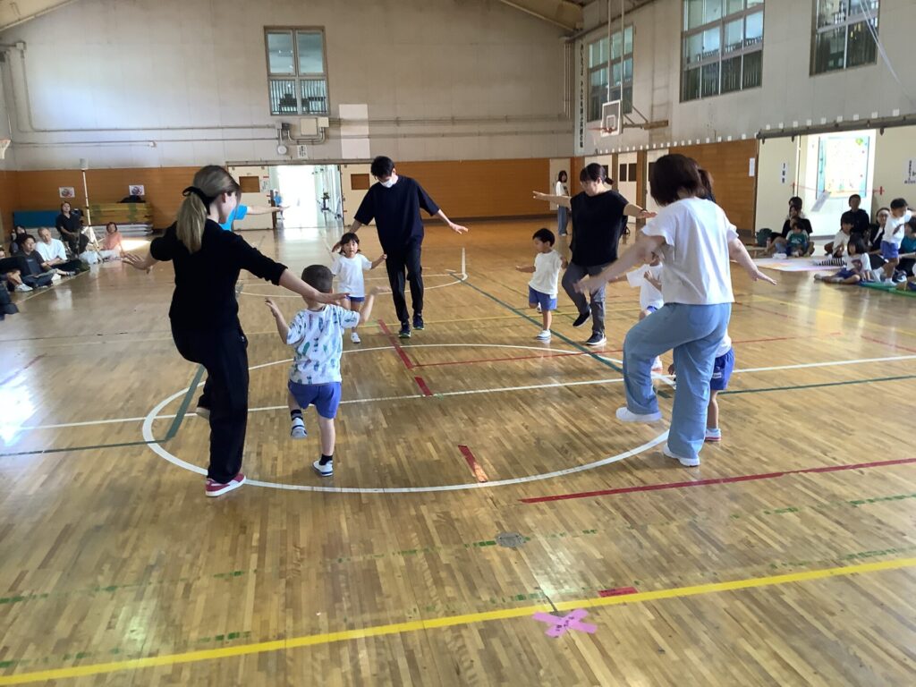 その後、みんな集まった子どもたちは、うれしくなって踊りを踊りました。踊っているうちにどんどん楽しくなった子どもたちは、お家の人も呼んで一緒に踊りました。親子みんなで運動会のオープニングを盛り上げました。