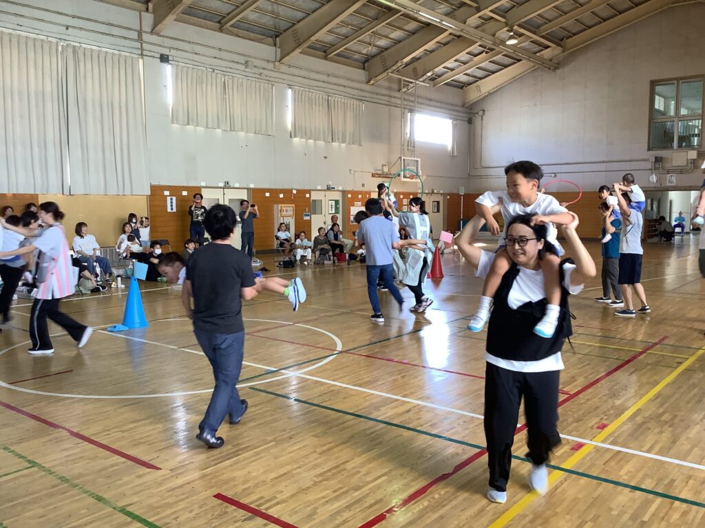 各学年の親子競技は親子で触れ合って遊ぶ内容です。動物や乗り物に変身したお家の方と嬉しそうに遊ぶ年少組、とんぼの親子になって虫取り網から楽しく遊んで逃げる年中・年長組。どちらも参加者はもちろん応援席から笑いが沸き上がる、楽しい競技となりました。