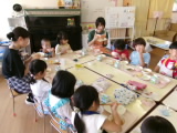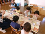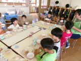 すきやきには、にんじん、小松菜、えのき、白菜、ねぎと沢山の野菜が入っていました。具沢山のすきやきは、子どもたちが苦手な野菜も美味しく食べることができるようです。豚肉と一緒に食べることで、より美味しさを感じることができました。