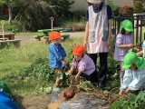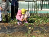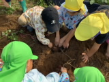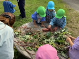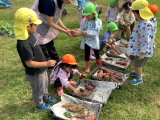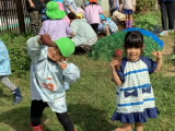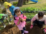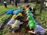 土が見えた畑を一生懸命掘り返します。「おいもどこだ?」「ツルがあるから・・・ここじゃないかな?」「・・・あった!大きいおいも!」「私もあった!誰か手伝って!」にぎやかな声があちこちから聞こえてきます。大きいおいも、長いおいも、小さいおいも、ずんぐりしたおいも・・・いろんなおいもを掘り出し、子どもたちは大喜びでした。