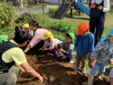 今日は子どもたちが待ちに待っていたいも掘りです!「たくさん掘るぞ!」朝からやる気たっぷりな子どもたちです。まずはもしゃもしゃに伸びたツルを引っ張ります。すると・・・「あ、おいもだ!」なんと、大きなおいもがくっついてきました。俄然張り切る子どもたちです。