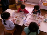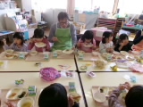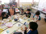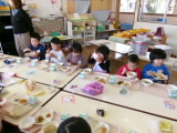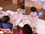 写真にある通り、鶏肉のはちみつレモンソースかけは大きかったですが、子どもたちもそれに負けないくらい大きな口を開けてよく噛んで食べている様子がみられました。はちみつレモンソースの味付けも美味しかったようで、満3歳児のお友だちもあっという間に完食していました!