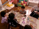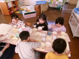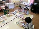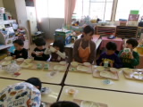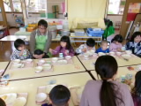 シャキシャキサラダは千切りにしたじゃがいも、きゅうり、にんじんに加えて今日はハムも入っていました。野菜のシャキッとした食感を楽しみながら食べていました。クリーミーなシチューは、子どもたちの体もあたたまったようでした♪