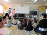 今日は、年中・年長組で風邪予防のための「咳エチケット」と「手洗い」について保健指導を行いました。最初に、咳やくしゃみをするとどのくらい飛沫が飛んでいくのか、ばい菌に見立てたボールを投げてみると、「こんなに飛んでいくの!?」「こっちまできたよ!」と驚いている様子でした。周りの人にうつさないようにするために、人のいない方を向いて咳やくしゃみをすること、マスクをしたりハンカチや服の袖(腕の部分)で口や鼻をおさえる『咳エチケット』について確認しました。