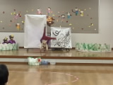 今年は参加型の劇となりました。途中何度か魔法や忍法の場面があります。子どもたちの合図で、お家の方が一斉にどんぐりマラカスを鳴らします。するとスクリーンの影絵がぐんぐんと大きく・・・!子どもたちの考えた仕掛けに、お家の方もびっくりしたり感心したりしていました。