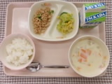 塩こうじチキンカツは、塩こうじの効果もあってか柔らかく食べやすかったです!また、ひじきには骨や歯を丈夫にしたり、イライラをおさえたりするカルシウムがたくさん含まれています。ほかにも、体をめぐる血液のもとになる鉄も多く含んでいます。鉄は体温を保ったり、貧血を予防したりします。「ぼく、ひじき大好きなんだ~!」と年少組の子も喜んで食べている姿がみられました。