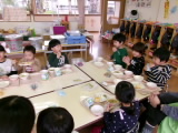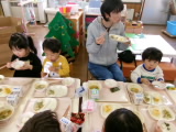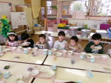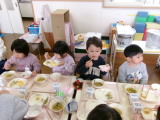 里いもは外はカリカリ、中はホクホクでとても美味しかったです。子どもたちは「ポテトの味がする~!」と喜んで食べていました。年少組では、厚焼き卵の”さとのいもこちゃん”のイラストをみて、「かわいい!」「トナカイさんかなぁ」とお友だちと話している微笑ましい様子もありました♪