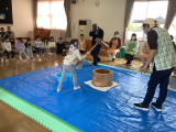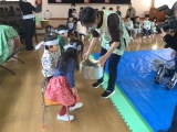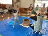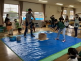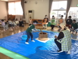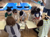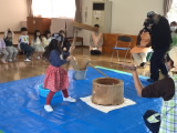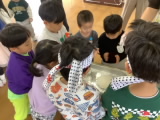 蒸しあがったもち米を見て、子どもたちは「ご飯みたい」「つぶつぶだよだよ」と口にしていました。最初にお家の方の力を借り目つぶしをしました。力いっぱいギュッギュッともち米がつぶされる様子を見て、子どもたちも手に力が入っていきました。その後ぺったんぺったんとお餅をつき始めると、同じ気持ちになってエアもちつきをする子が何人もいました。