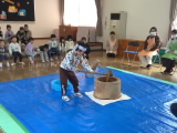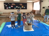 あらかたつきあがったところで、いよいよ年長組の出番です。足を踏ん張り杵を持ち上げ、一人ずつぺったん!と力強く仕上げをしてくれました。「ドキドキしたけど楽しかった!」と皆口にしていました。