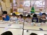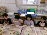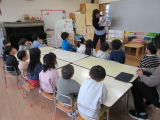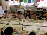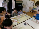 野菜のもつパワーも、よく噛んで食べなければ体に届きません。『いつもより5回多く噛む!』ことを頑張ってほしいと子どもたちに伝えました。最後に、足ぴったん・背中ピンの姿勢で、顎の付け根あたりを触りながら噛む練習をしました。子どもたちも「骨が動いてる!」と、しっかりと噛むことができている状態について実感している様子でした。