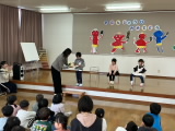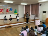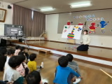 先生たちのプレゼントはパネルシアター『カラフル温泉』です。青や赤、黄色や緑と、カラフルな温泉に動物たちが入ると・・・あらら!色が変わってしまいました。「パンダが来たよ」「ということは・・・やっぱり!色が変わった!」次の展開を予想しながら、大笑いしていました。