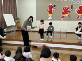 年長組の誕生児は得意技で大縄跳びを披露しました。前日から「最近頑張っているんだ!」と張り切っていて、今日は見事なジャンプを見せてくれました。「縄をよく見て、足をそろえてジャンプするんだよ」と、うまく飛ぶコツも教えてくれました。さすが!