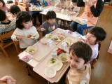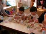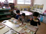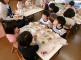 今日は子どもたちが大好きなハンバーグもでました。トマトソースを口の周りにつけながらも美味しそうにハンバーグを頬張っている姿がみられました♪