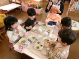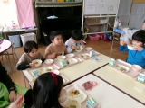今日は幼稚園で豆まきの会をしました。子どもたちは「鬼は~外、福は~内」と保育室や玄関で豆まきをして、幼稚園中の鬼を追い払ってくれました。みんなの心の中の鬼もいなくなったかな?