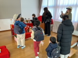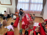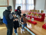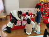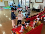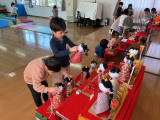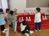 年長組と年中組が力を合わせて、積み木を集めたり毛氈をかけたりして、おひな様を飾る段を作りました。そこにそれぞれの学年の色とりどりのおひな様を並べました。「年少さんのかわいい!こんなの私も作ったなあ」「年中さんのは着物がきれい!」「年長さんのおひな様、刀持ってる!刀が固くてかっこいい!」それぞれの学年のおひな様を見て、子どもたちは感じたことを嬉しそうに、友達や教師に伝えていました。