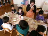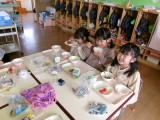 年中年長の子どもたちは電車に乗って、つるし雛や雛飾りを見に行ったり、駄菓子屋へ行ったりしてきました。園に戻ってからの給食の時間、年中組では大切に持ち帰った駄菓子の入った袋を机の上に並べ、「早く食べたいなぁ」と眺めながら給食を食べていました!大好きなお菓子を見守りながらの給食は、いつも以上に美味しかったようで、みんなあっという間に完食していました♪