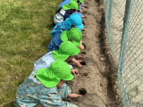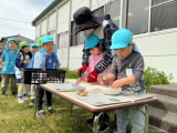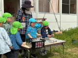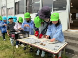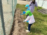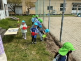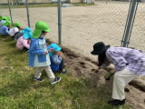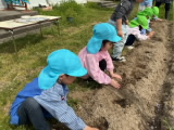年長組の保育室ベランダ前に畑を作りました。今日は、年長組・年中組でジャガイモの種イモを植えました。先生と一緒に種芋を包丁で切り、腐敗防止の灰を付けてから、優しく畑に植えました。しっかりと土をかけた後、みんなで水やりをしました。「たくさんあげるね」と、気持ちを込めて水をあげていました。