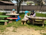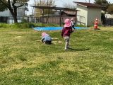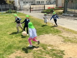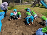 今日はとても良い天気でした。年長組・年中組は畑の土作りの後は、園庭で元気に楽しく遊びました。年少組のお友達も午後に園庭に出て、遊具や草花探しなどで元気に楽しく遊びました。