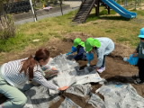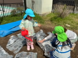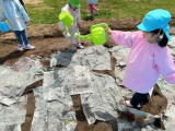 細い糸のような菌糸が集まった菌ちゃんが見つかりました。子どもたちは「どこどこ?」「これかな?」と、畑のあちこちで菌ちゃんを探していました。菌ちゃんがもっと元気になってたくさん仲間を増やせるように、みんなで畑の土をかき混ぜました。その後、新聞紙を敷き、水をかけて湿り気を加えました。週明けにまた様子を見て見たいと思います。菌ちゃんがどんな風に変化するか、楽しみです。