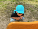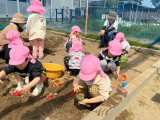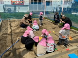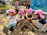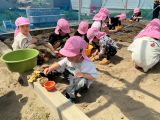 年少組は砂場デビューをしました。サラサラの砂を触り「あったかいね」とつぶやいたり、少し湿った砂をギュッと入れ物に詰め「できた!」と型抜きを楽しんだりしていました。