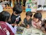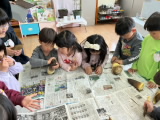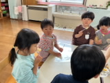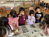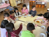 お友達がお家から竹の子を持って来てくれました。採りたての皮つきの竹の子に子どもたちは興味津々でした。「どんな味かな?」「食べてみようよ!」・・・年長組が竹の子の皮をむきます。その姿をお手本にして、年中組も皮むきにチャレンジしました。きれいに皮がむけた竹の子を、職員がゆでてあく抜きをしました。