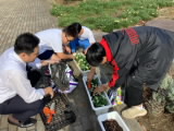 ビオラが味方中学校の玄関前で皆さんをお迎えします。