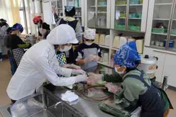 3年生がます団子作りに挑戦しました。ます団子は味方に伝わる笹団子の一種で,あんとして鱒を入れたものです。子どもたちは鱒を入れた団子を笹で包み,「すげ」で結びました。最初はうまく結べなかった子も練習 …